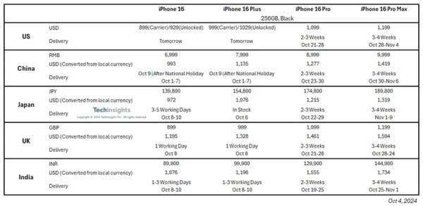 10月4日五大市場(chǎng)iPhone16系列零售價(jià)和交付周期