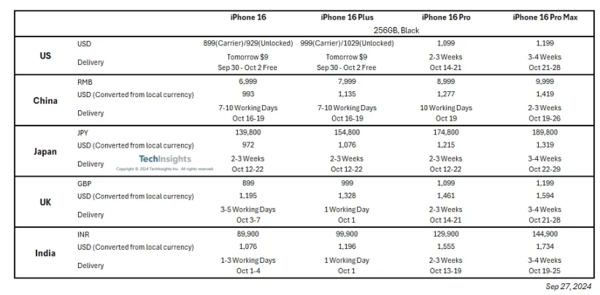 9月27日五大市場(chǎng)iPhone16系列售價(jià)和交付周期