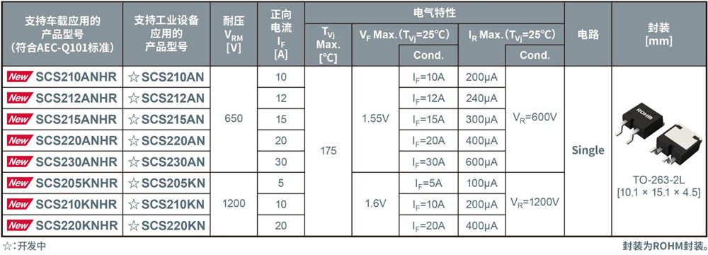 目前有650V耐壓和1200V耐壓兩種產(chǎn)品,不僅適用于xEV中廣為使用的400V系統(tǒng),還適用于預(yù)計(jì)未來會擴(kuò)大應(yīng)用的更高電壓的系統(tǒng)。另外,新產(chǎn)品的焊盤圖案與TO-263封裝的普通產(chǎn)品和以往產(chǎn)品通用,因此可以直接在現(xiàn)有電路板上替換。此外,車載設(shè)備用的“SCS2xxxNHR”還符合汽車電子產(chǎn)品可靠性標(biāo)準(zhǔn)AEC-Q101*4。