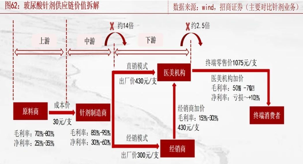 上游,以愛(ài)美客、華熙生物為代表的擁有技術(shù)壁壘和品牌效應(yīng)的廠商在定價(jià)上擁有極高的話語(yǔ)權(quán);下游,以新氧、美團(tuán)醫(yī)美、天貓醫(yī)美為代表的渠道商傭金高昂;受上下游擠壓,中游醫(yī)美機(jī)構(gòu)只能在夾縫中求生,凈利率低下。