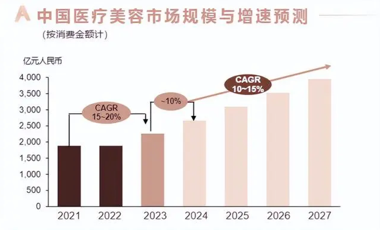 中國(guó)整形美容協(xié)會(huì)、德勤中國(guó)等聯(lián)合發(fā)布的《中國(guó)醫(yī)美行業(yè)2024年度洞悉報(bào)告》預(yù)測(cè),受醫(yī)美滲透率不斷提升和多元化品質(zhì)醫(yī)美需求驅(qū)動(dòng),中國(guó)醫(yī)美市場(chǎng)預(yù)計(jì)在未來(lái)幾年內(nèi)仍可保持10%-15%的快速增長(zhǎng),其中注射類(lèi)醫(yī)療美容項(xiàng)目增速將達(dá)到20%-30%。